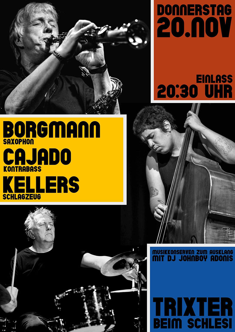 das zweite stück ist dann von der cd und jetzt fliegt es auch wie dort, mit borgmann im fliegenden wechsel seiner saxophone, mit dem verschroben originellen swing, den kellers drauf hat, den man nicht lernen kann. grandioses bass-solo, grandioses drumsolo (mit gong, daumenklavier und 30 jahre spielpraxis).