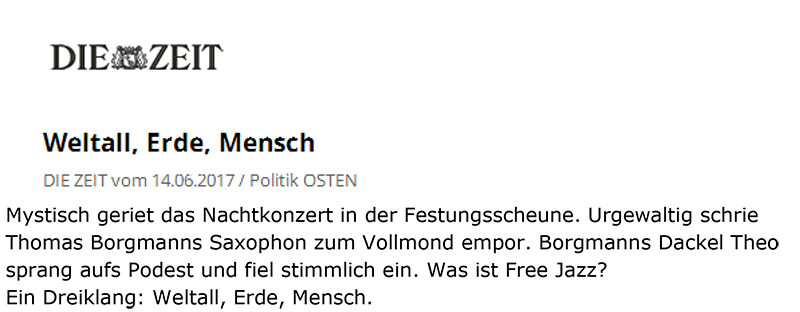 Borgmann is a saxophonist who has the melodic touch, and who layers fine melodies out of the loosely composed "ideas", thus becoming the most important voice in the trio.(...)